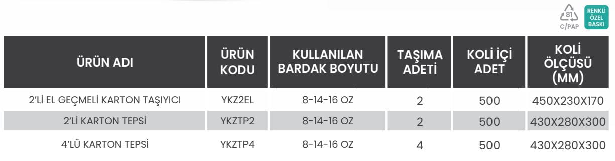 Paket servislerinizde güven ve pratiklik bir arada! Çevre dostu, geri dönüştürülebilir malzemeden üretilen 2'li ve 4'lü karton içecek tepsilerimiz, sıcak ve soğuk içeceklerin dökülmeden, güvenle taşınmasını sağlar.